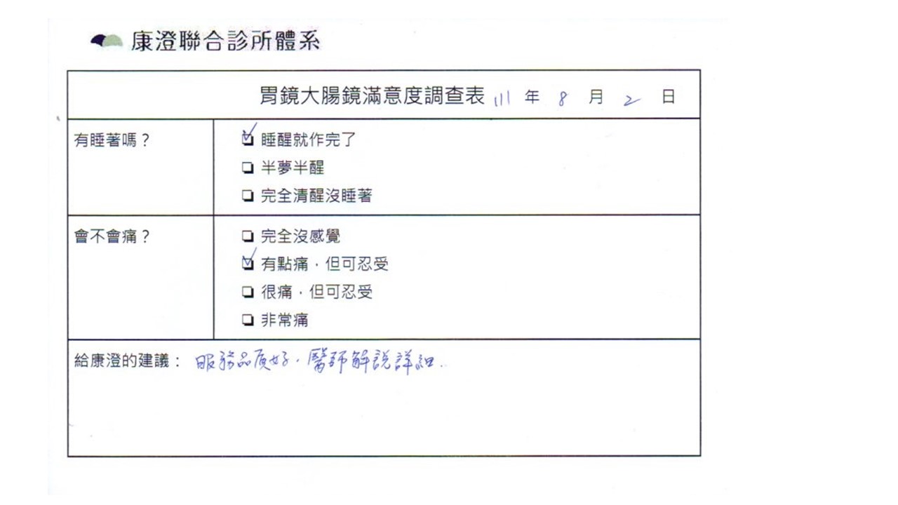 「還好有康澄,做大腸鏡及胃鏡及痔瘡切除,無痛,快速的完成療程,即時也切除了大腸息肉,身體更健康了,開心!」