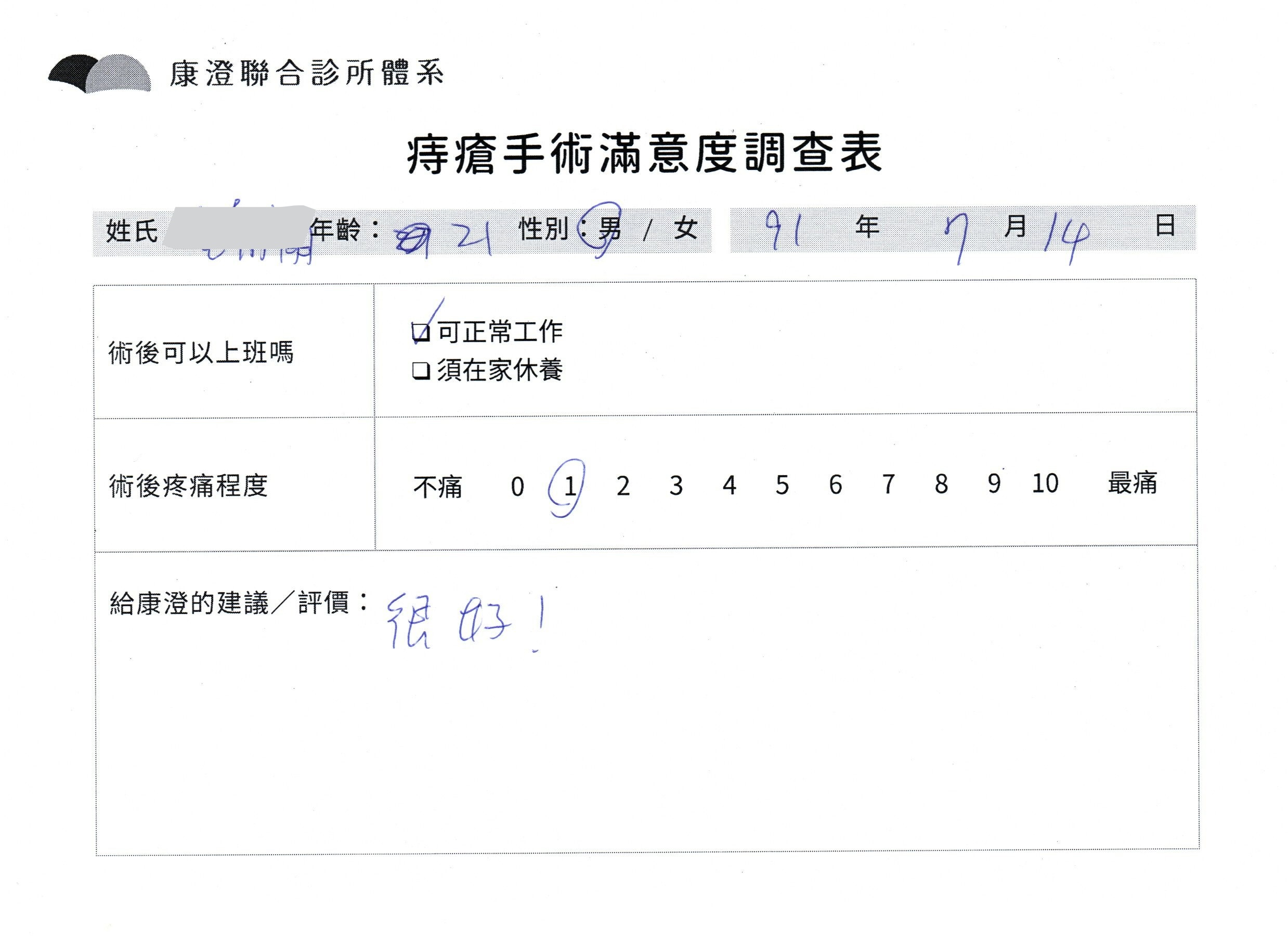 「整體的手術流程很舒服,人員專業貼心,醫生也很專業讓人信任!術後當下微微暈,休息一下就恢復。前三天密集照護傷口,恢復很好,可以正常活動,一周後就回診確認狀況,謝謝康澄的所有人員!」