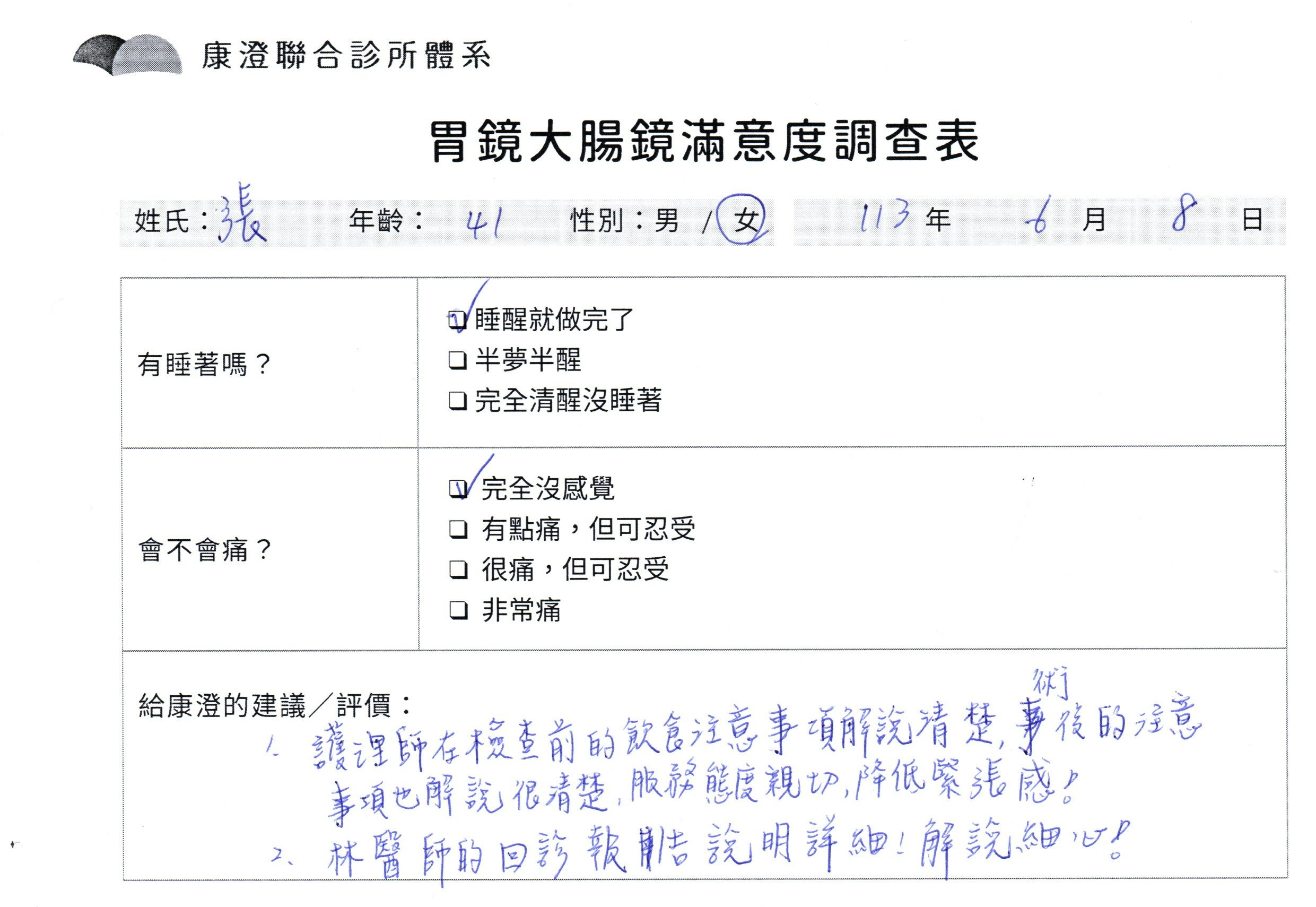 「護理師在檢查前的飲食注意事項解說清楚,術後的注意事項也解說很清楚,服務態度親切,降低緊現感!林醫師的回診報告說明詳細!解說細心!」